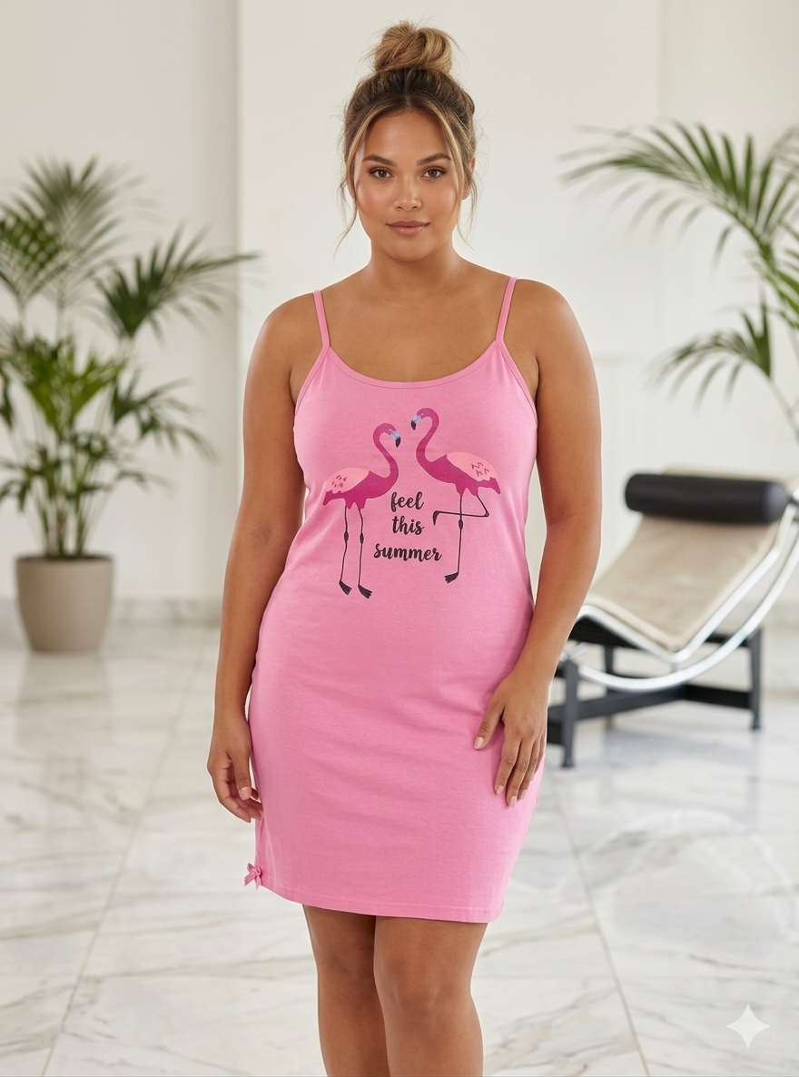 Camisola, confeccionada em malha, modelo regata e linda estampa de Flamingo.