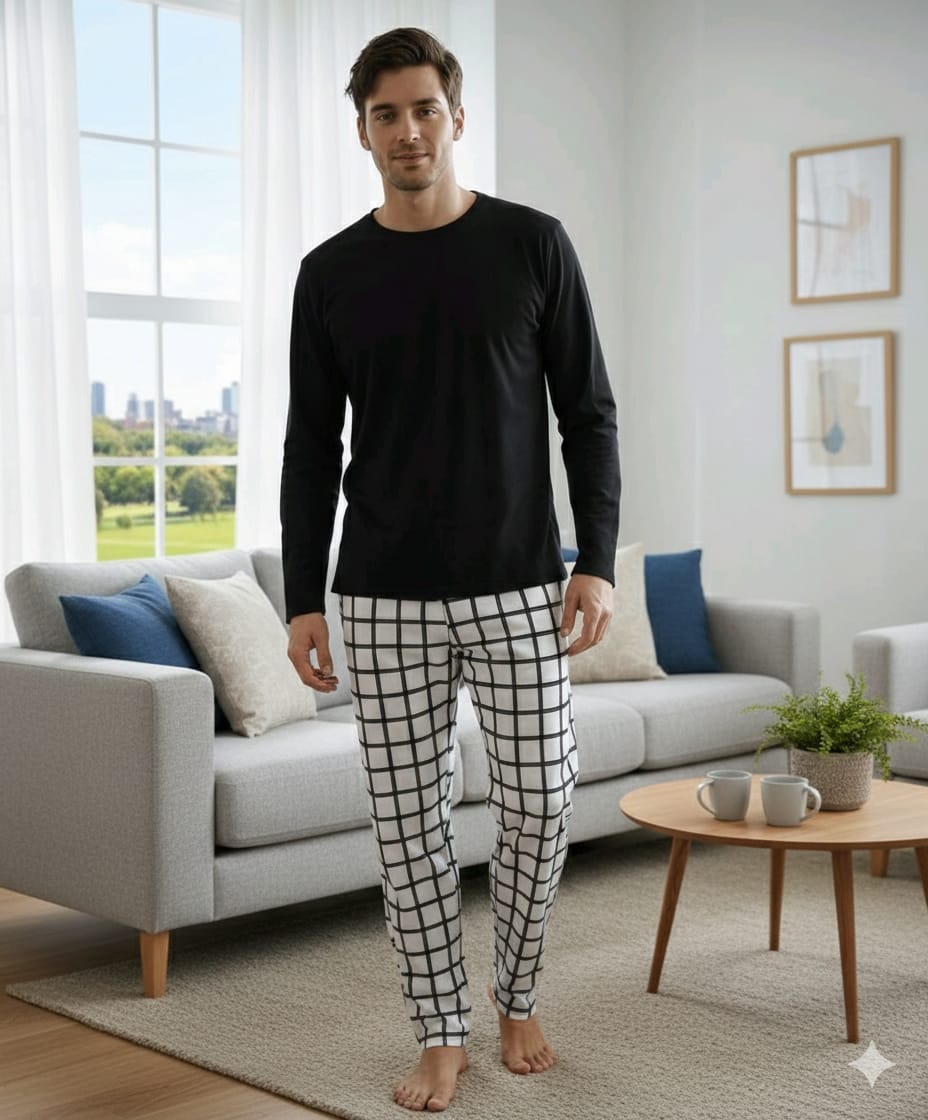 Parte inferior: Uma calça de corte reto com estampa xadrez "grid" (quadriculado preto sobre fundo branco e quadriculado cinza sobre o fundo branco), criando um contraste moderno e clen e black.